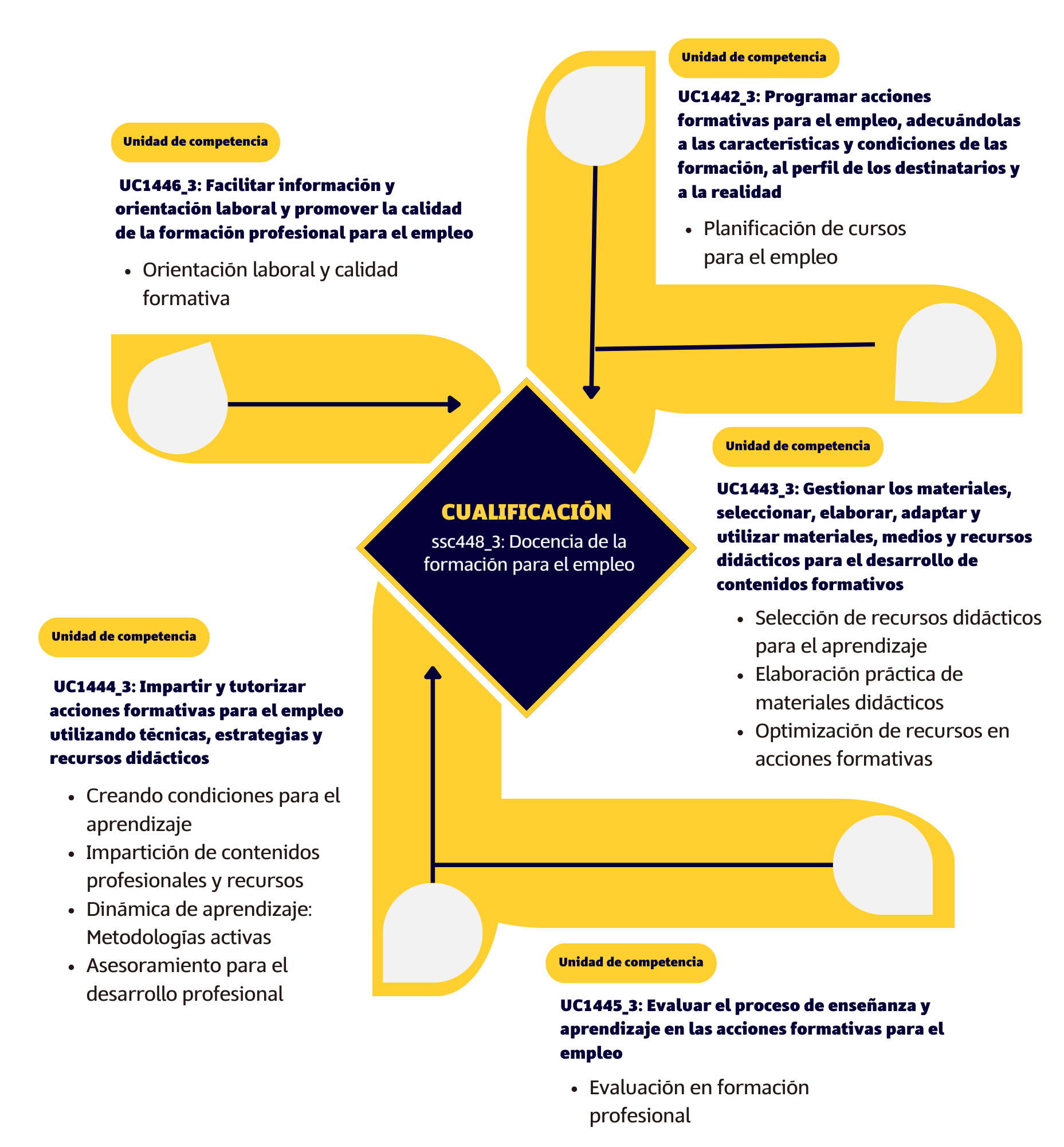 Cada cualificación profesional se compone de 5 unidades de competencias, que a su vez están formadas por diversas acciones formativas. En ese caso, 10 cursos, impartidos en modalidad 100% online.
